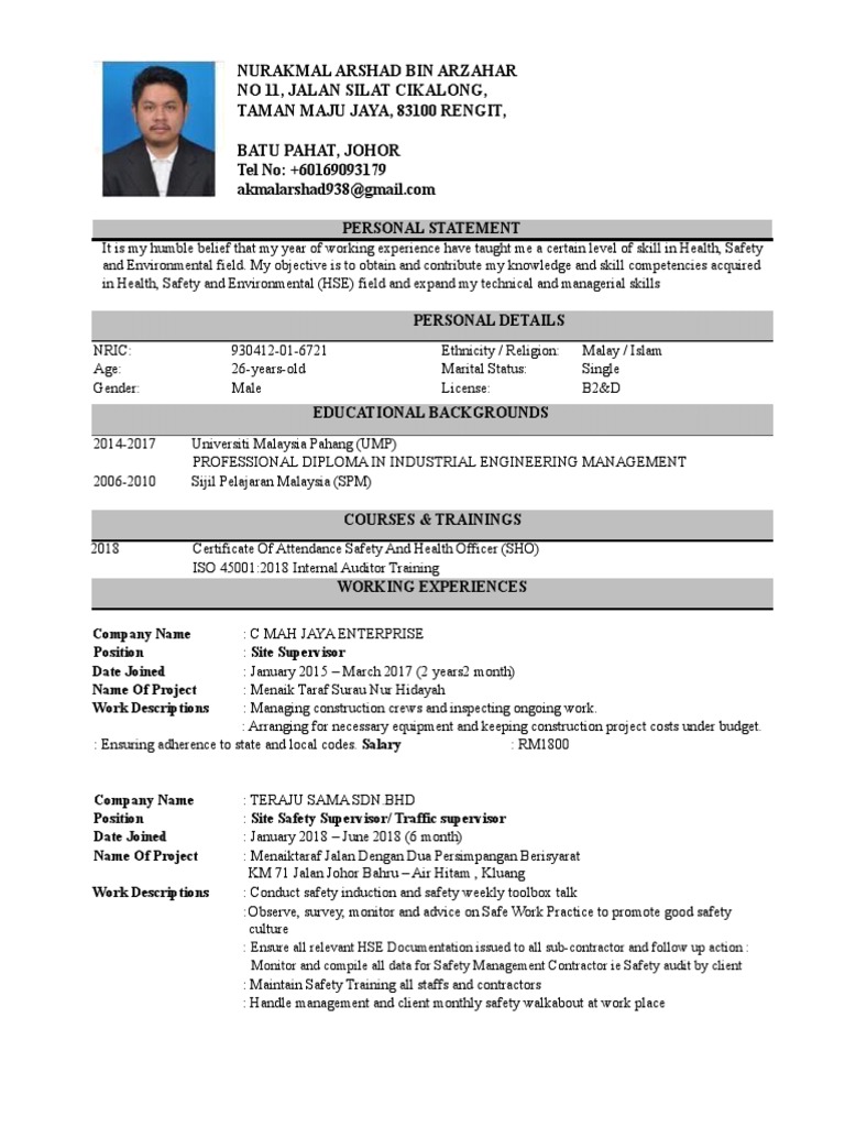 Akmal Resume Baru Pdf Occupational Safety And Health Safety